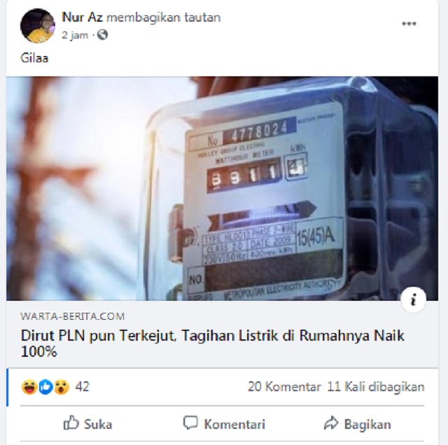 Adalah akun facebook Nur Az yang membagikan tautan artikel dari laman WARTA-BERITA.COM. Artikel yang diterbitkan pada Minggu 7 Juni 2020 itu berjudul "Dirut PLN pun Terkejut, Tagihan Listrik di Rumahnya Naik 100%".